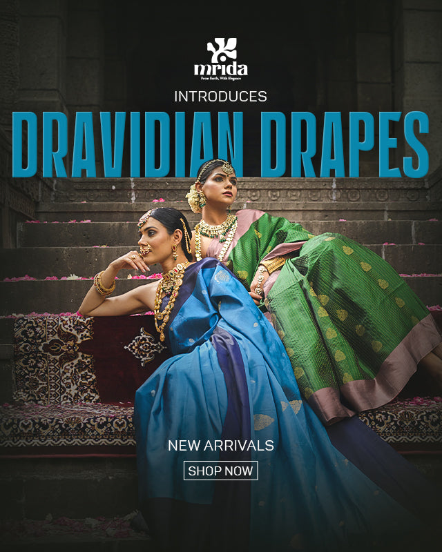 The Dravidian Drapes collection is a tribute to the rich textile heritage of South India, featuring handwoven Pattu silks from Tamil Nadu, Pochampally Ikat, Pure Mulberry Silks, and Raw Silks. Each saree is crafted using traditional techniques, celebrating the timeless elegance of South Indian weaves.